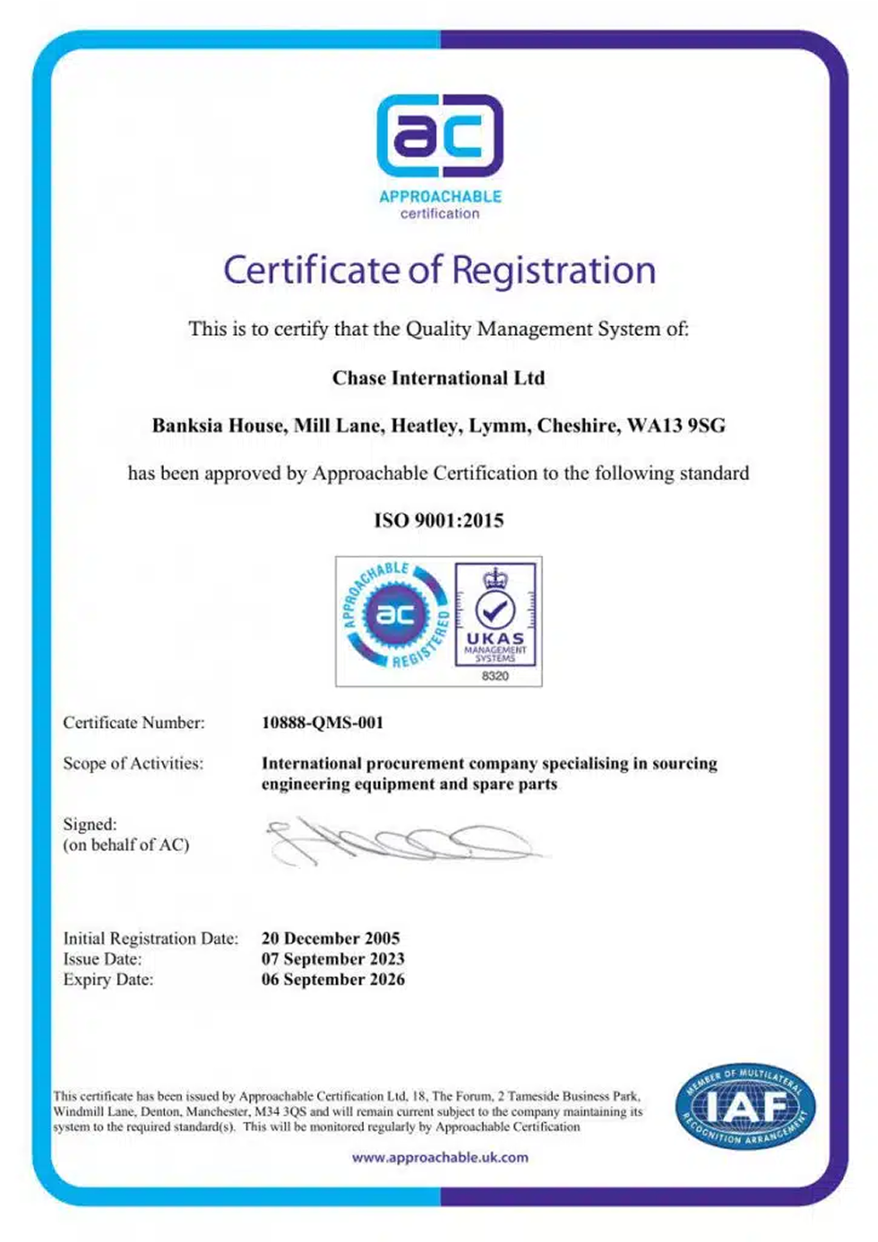 CHASE International is certified ISO 9001:2015 and has been for many years, demonstrating our commitment to high quality procedures as well as outstanding, friendly service.